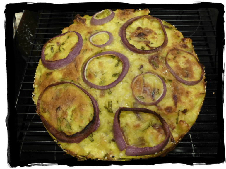 6. Line the base and sides of a 9” spring form pan with parchment paper. Brush the sides with butter and sprinkle the seeds to coat the sides and bottom of the lined pan. Pour cauliflower mixture into the pan. Top with onion rings. Bake 45 minutes. Remove from oven and let rest for 20 minutes before serving.