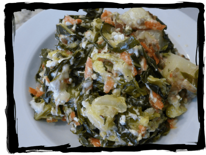 3. Melt butter in a large, deep pot and sauté onions about 5 minutes. Add salt and caraway seeds. Add cabbage, collards and kohlrabi and sauté for 10 minutes. When greens are tender, add carrots, garlic and dill. Cook 5 more minutes and remove from heat.