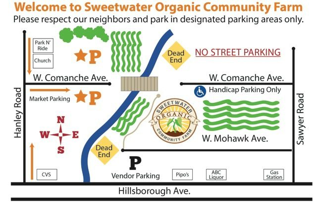 Parking on Comanche Avenue off of Hanley Road is the preferred parking area (see above).  However, Thursday CSA Members and Sunday Market Vendors may chose to park in the limited space available along the chainlink fence on the south end of our property on Mohawk Avenue.  Traveling west on Hillsborough Ave. from the Veteran’s Expressway, turn right on Sawyer Rd. (Shell station.) Take the next left on Mohawk Ave.  Drive to the end and park along the chainlink fence.  Walk through the opening in the fence, down the driveway to the farm.